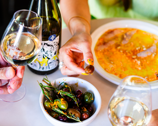 LES OLIVES CHAUDES ET LE CRUDO DE BAR RAYÉ DU MANO CORNUTO